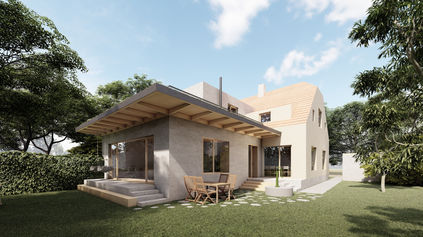 Zadáním bylo rozšířit rodinný dům tak, aby v přízemí vznikl prostor pro rodinu s dětmi a ve druhém patře byt pro jejich rodiče